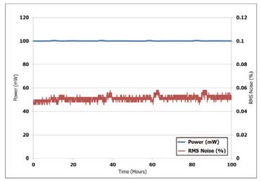 右圖, Ventus 532 出光100 個小時后的輸出功率( 藍線) 及噪聲~0.06%( 紅線) 變化圖