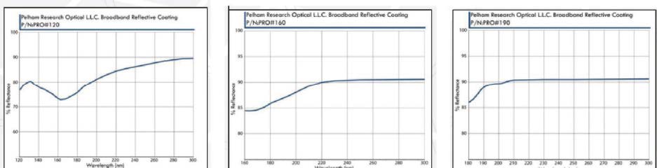 Pelham Research Optical(PRO)VUV / UV 寬帶鏡面涂層設(shè)計用于在真空臨界波長下提供良好的反射率。 為了確保質(zhì)量的一致性,每個涂層批次在12 度入射角下測量反射率。可以根據(jù)客