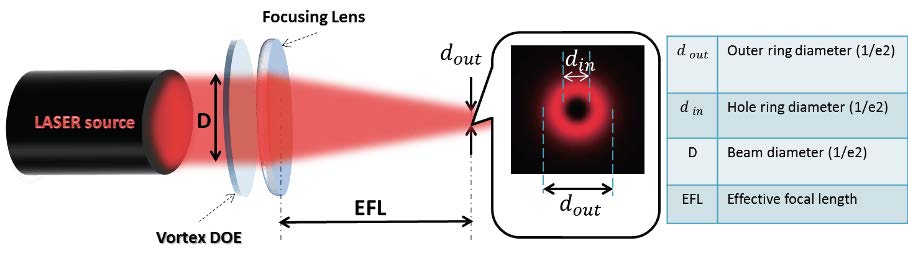 衍射光學(xué)元件(Diffractive Optical Elements,DOE)是新型的微納光學(xué)器件,通常是在光學(xué)基底的表面通過(guò)光刻工藝制造的二維陣列排列或訂制規(guī)律排列的、微米尺度的衍射單元。激光經(jīng)過(guò)衍射光學(xué)元件后其波前位相被精密調(diào)控,從而實(shí)現(xiàn)在一定位置(通常是焦點(diǎn))的特定強(qiáng)度分布、位相分布,并可實(shí)現(xiàn)縱向傳播特性調(diào)控。