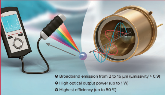 Infrasolid 的紅外輻射源是具有近黑體發射率的脈沖熱發射器。基于獲得**的納米技術和由高熔點金屬制成的發射器裝置,具有納米結構發射器表面的獨立 式單片輻射元件在許多應用中提供了許多優勢。為FTIR應用提高更*效的紅外光源。