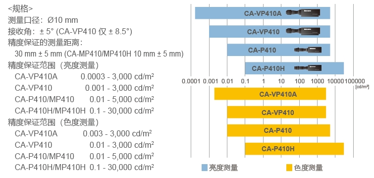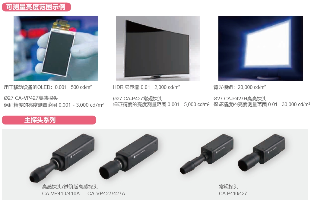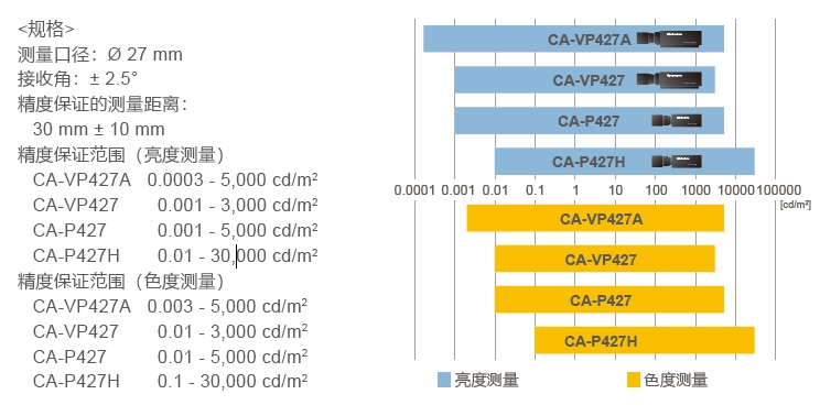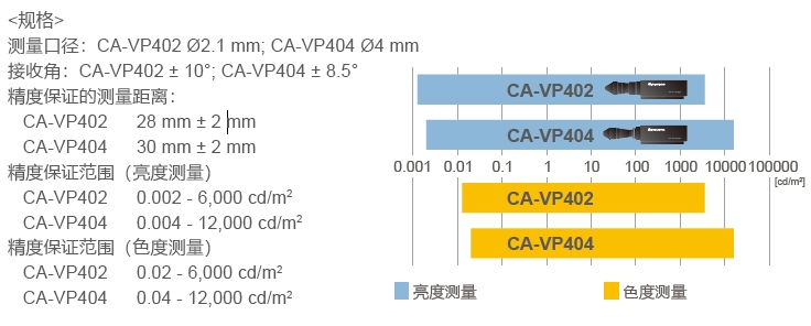進階版高靈敏度探頭CA-VP427A和CA-VP410A作為系列新產品,從0.0003cd/m2的超低亮度開始,保證精度范圍。