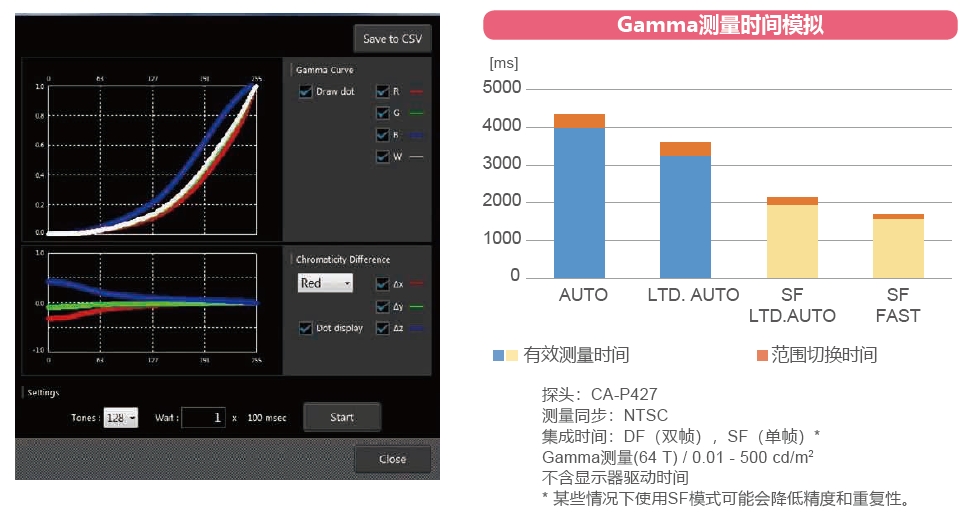 憑借高傳感器靈敏度和高速計算性能,CA-410縮短了多次執行亮度和色度評估和調整(如Gamma測試)所需的時間。甚至為了進一步提高速度性能,CA-410提供了LTD。AUTO模式,增加測量速度,同時保持與CA-310相同或更好的精度。此外,(SF單幀)模式允許用戶設置積分時間以增加同步測量。其設計目標是在以測量速度為關鍵的過程(如OLED的產線色彩調整)中提高生產率。