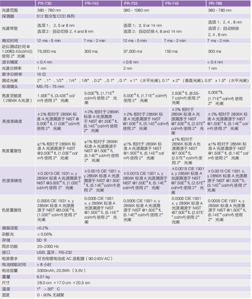 Photo Research 公司擁有幾十年的光度計生產(chǎn)制造經(jīng)驗,并推出超靈敏光譜測試系統(tǒng) - 制冷型號探測器PR-730/735 和 PR-740/745 , PR-788 光譜式光度色度輻射度計。PR-730 和 PR-740, PR-788 覆蓋可見光譜,從 380nm 到 780nm, 而 PR-735 和 PR-745 覆蓋 380nm 到1080nm 可見光到近紅外光譜波段,是針對近紅外輻射度測試的最佳方案。PR-788 具有業(yè)界領(lǐng)先的 1000000:1 的動態(tài)范圍,它提供了在不必增加外部衰減或改變幾何光學(xué)(例如測量場地尺寸)的情況下,即可從黑到全白測試設(shè)備輸出的解決案。