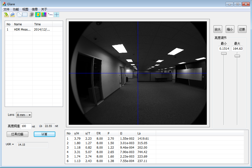 Glare眩光測量軟件解決了不同的環(huán)境光源和觀察者視角的空間位置對應關(guān)系,合理準確地描述了光在人眼的散射效應。對不同的照明條件和環(huán)境,做了相應的測試方案,解決了室內(nèi)、室外等不同場景的眩光測試。