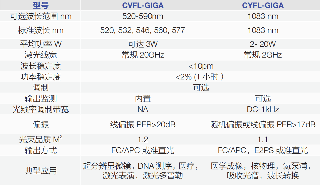 法國 Keopsys 公司的 GIGA 系列的高穩定性光纖激光器標準提供 GHz 級別的常規激光線寬,在 520-590nm 綠光波段可提供 3W, 在 1083nm 近紅外波段可提供 20W 的功率輸出。應用于超分辨顯微鏡,醫學影像等領域