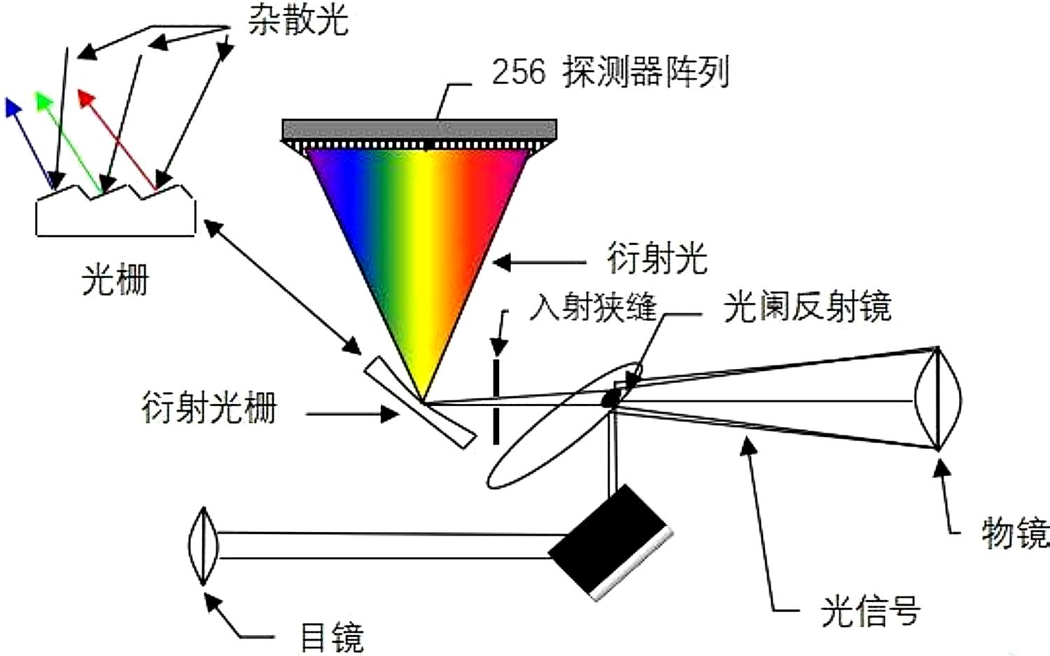入射狹縫決定了進(jìn)入單色器的光的多少。狹縫越小,分辨率越高,但整體靈敏度越低。衍射級次過濾器用于減少光柵衍射的高級衍射光。準(zhǔn)直器將光線準(zhǔn)直到光柵或棱鏡。無論是使用光柵分光,還是用棱鏡分光,儀器測得的光源數(shù)據(jù)都是一致的。光柵或棱鏡用于入射光的色散。匯聚光學(xué)元件將光線匯聚到探測器(光電倍增管、CMOS傳感器或CCD陣列)上??刂坪腿罩鞠到y(tǒng)用于定義和存儲數(shù)據(jù)。
