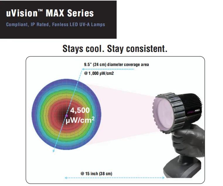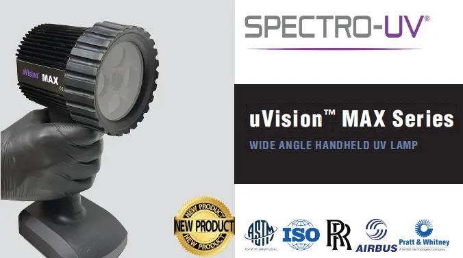 uVision™ MAX 系列代表了 Spectro-UV 在手持式無損檢測技術領域的又一次革新。該燈具在 38 cm工作距離下可提供廣角 UV-A覆蓋,覆蓋區(qū)域直徑達 24 cm。該系列基于成熟的 uVision 平臺打造,具有IP65 防護等級、無風扇熱管理以及合規(guī)等特性。