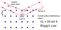 布拉格定律:當(dāng)X射線束的入射角滿足晶面間X射線路徑長(zhǎng)度的差值為波長(zhǎng)的整數(shù)倍時(shí),就會(huì)發(fā)生相長(zhǎng)干涉,產(chǎn)生衍射光束